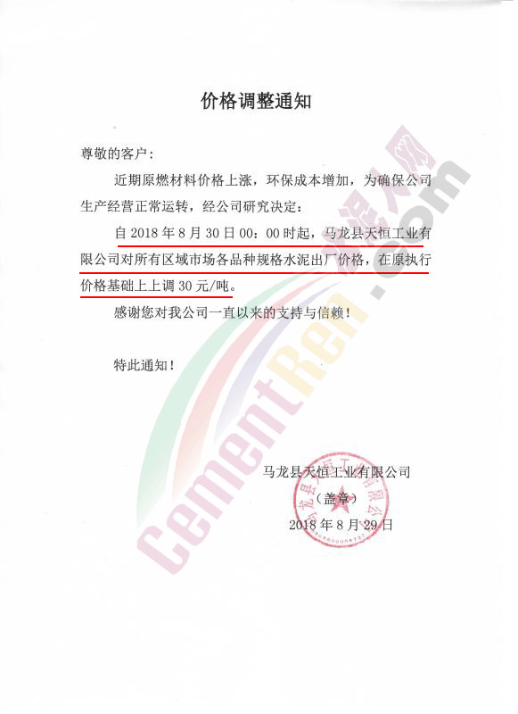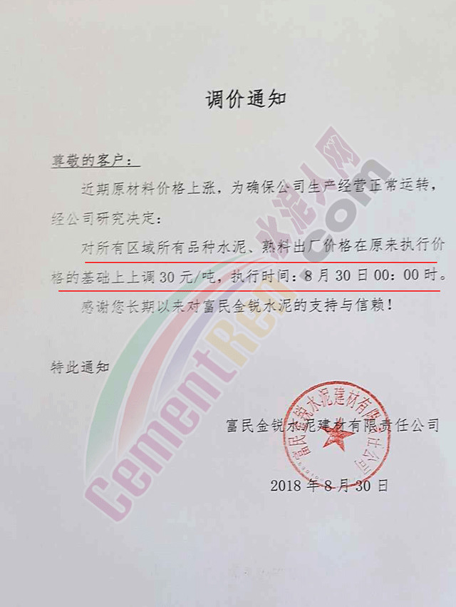 富民金銳水泥建材有限責(zé)任公司調(diào)價(jià)通知稱(chēng):由于近期原材料價(jià)格上漲,為確保公司生產(chǎn)經(jīng)營(yíng)正常運(yùn)轉(zhuǎn),經(jīng)公司研究決定 ,自今日(8月30日)零時(shí)起對(duì)所有區(qū)域品種水泥、熟料出廠價(jià)格在原執(zhí)行價(jià)格基礎(chǔ)上上調(diào)30元/噸。