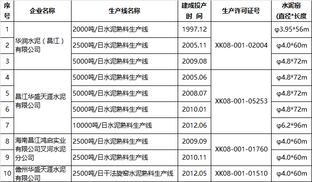 海南省水泥熟料生產(chǎn)線清單