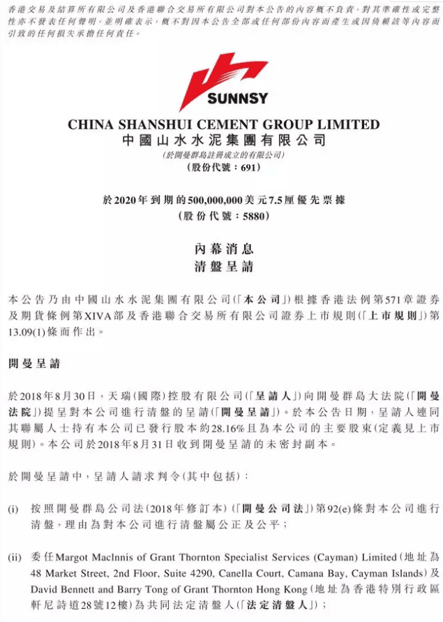 山水水泥(00691)公告,于2018年8月30日,天瑞(國際)控股有限公司(呈請人)向開曼群島大法院(開曼法院)提呈對公司進行清盤的呈請(開曼呈請)。于公告日期,呈請人連同其聯(lián)屬人士持有公司已發(fā)行股本約28.16%且為公司的主要股東。公司于2018年8月31日收到開曼呈請的未密封副本。