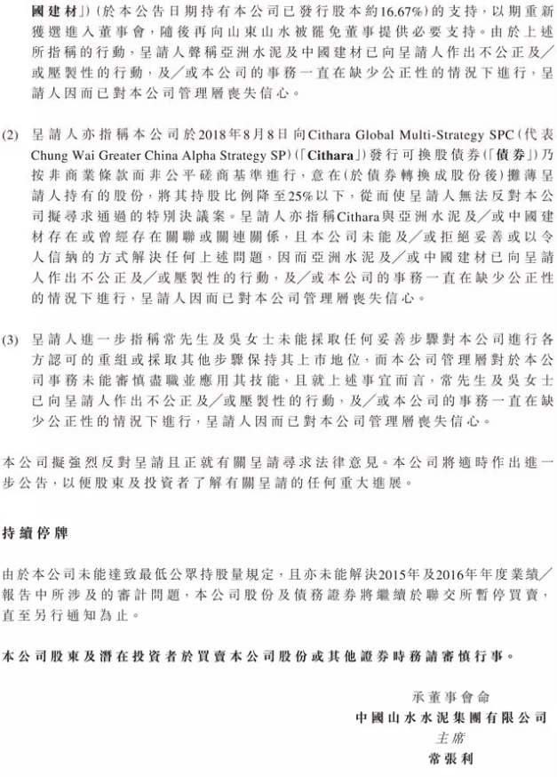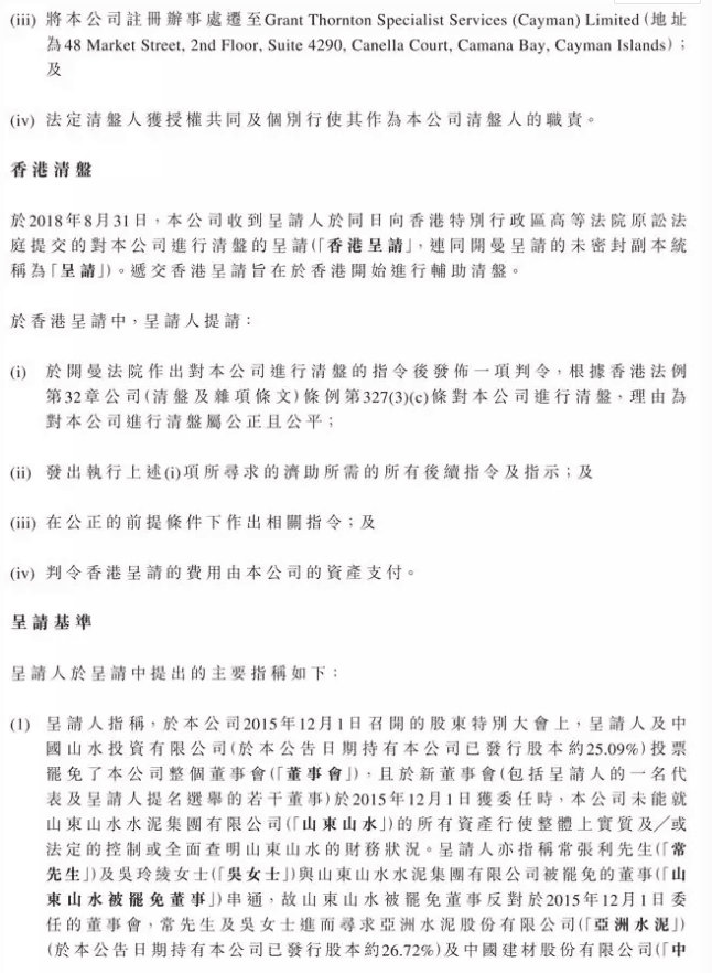于2018年8月31日,公司收到呈請人于同日向香港特別行政區(qū)高等法院原訟法庭提交的對公司進行清盤的呈請(香港呈請)。遞交香港呈請旨在于香港開始進行輔助清盤。