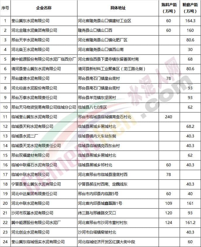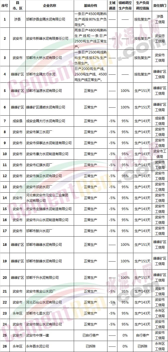 (一)水泥企業(yè)(不含粉磨站)除承擔(dān)居民供暖、協(xié)同處置城市垃圾或危險(xiǎn)廢物及高速公路重點(diǎn)建設(shè)項(xiàng)目等保民生任務(wù)的,要根據(jù)承擔(dān)任務(wù)量核定最大允許生產(chǎn)負(fù)荷外,其余企業(yè)錯峰期間全部停產(chǎn),在2018年9月底前報(bào)邯鄲市人民政府備案。水泥粉磨站按通用指標(biāo)進(jìn)行績效評價(jià),最終確定企業(yè)采暖季錯峰生產(chǎn)方案。9月底未按標(biāo)準(zhǔn)驗(yàn)收合格的企業(yè)停產(chǎn)。
