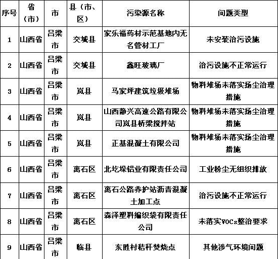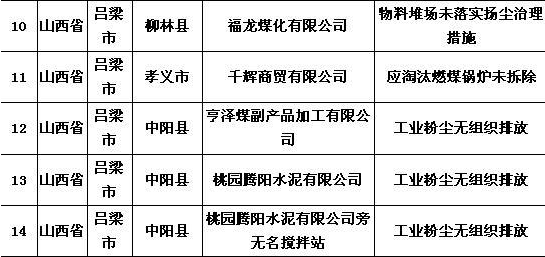 其中,山西省晉中市昔陽縣1家(排氣筒高度不足15米),臨汾市安澤縣1家(排氣筒高度不足15米),運城市臨猗縣1家(煙囪高度不足35米)、夏縣1家(排氣筒高度不足15米);河南省洛陽市西工區(qū)1家(排氣筒高度不足15米)企業(yè)廢氣排放口設(shè)置未達(dá)到環(huán)評要求。