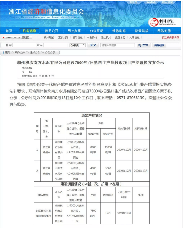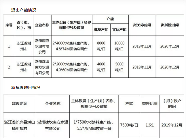 熟料生產(chǎn)線技改項目產(chǎn)能置換方案公示》。公示文件稱:按照《國務院關于化解產(chǎn)能嚴重過剩矛盾的指導意見》和《水泥玻璃行業(yè)產(chǎn)能置換實施辦法》要求,現(xiàn)將湖州槐坎南方水泥有限公司建設7500噸/日熟料生產(chǎn)線技改項目產(chǎn)能置換方案予以公示。公示時間為2018年10月18日起10個工作日。聯(lián)系電話:0571-87058139。歡迎社會公眾進行監(jiān)督。