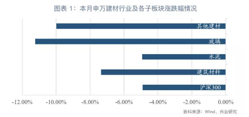 本月大盤持續(xù)表現(xiàn)不佳,滬深300指數(shù)下降4.90%,申萬建材指數(shù)下降7.35%,其中水泥板塊下降4.93%,水泥板塊表現(xiàn)出較強(qiáng)韌性。