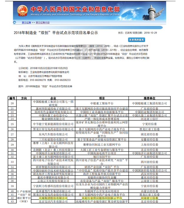 10月22日,工信部公示了2018年制造業(yè)“雙創(chuàng)”平臺試點示范項目名單。經(jīng)企業(yè)自主申報、地方推薦和專家評審,工信部擬將土工合成材料生產(chǎn)制造協(xié)同創(chuàng)新平臺等150個項目核定為2018年制造業(yè)“雙創(chuàng)”平臺試點示范項目。水泥行業(yè)中,天瑞集團股份有限公司的水泥行業(yè)供應(yīng)鏈協(xié)同創(chuàng)新云平臺項目成功入選。公示時間為2018年10月22日至2018年10月29日。
