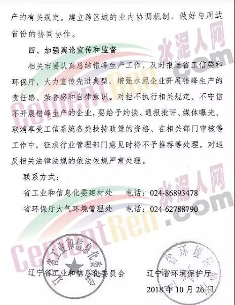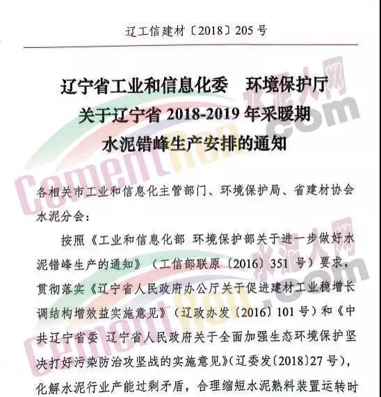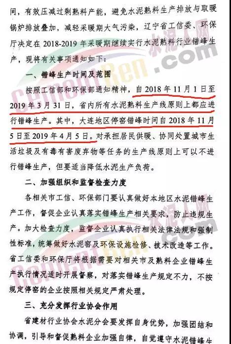 同日,遼寧省工信委和環(huán)保廳也聯(lián)合發(fā)布了《關(guān)于遼寧省2018-2019年采暖期水泥錯峰生產(chǎn)安排的通知》。根據(jù)該文件相關(guān)規(guī)定,自2018年11月1日至2019年3月31日,遼寧省內(nèi)水泥熟料生產(chǎn)線原則上都應(yīng)進(jìn)行錯峰生產(chǎn),其中大連地區(qū)停窯錯峰時間為2018年11月5日至2019年4月5日,對承擔(dān)居民供暖、協(xié)同處置城市生活垃圾及有毒有害廢棄物任務(wù)的生產(chǎn)線原則上可以不進(jìn)行錯峰生產(chǎn),但要適當(dāng)降低水泥生產(chǎn)負(fù)荷。