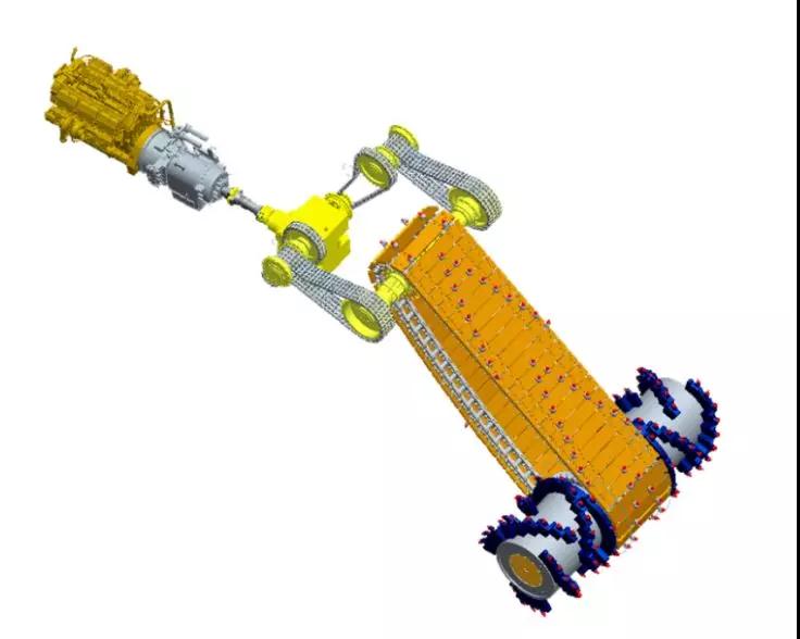 同時由于采用機械式傳動,整個系統(tǒng)更加簡單,消耗更加低,維修更加方便。相比較在作業(yè)條件艱難的礦山使用,尤其是抗壓強度超過80Mpa的巖石工作, 其比液力傳動的采礦機適用性更強;切割滾筒置于端部,更容易域的工作;設備為開溝機發(fā)展而來,具有良好的爬坡能力,也能夠更好的應用于礦山基建和采準工作。