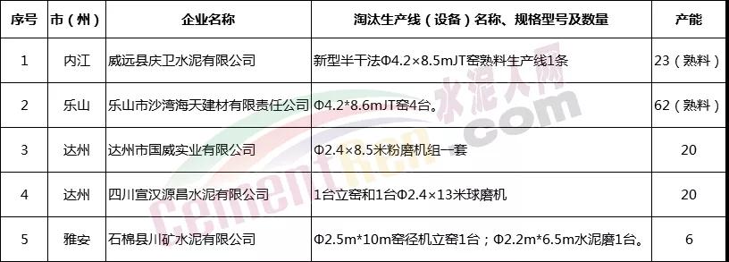 五家水泥企業(yè)分別為威遠(yuǎn)縣慶衛(wèi)水泥有限公司、樂山市沙灣海天建材有限責(zé)任公司、達(dá)州市國威實業(yè)有限公司、四川宣漢源昌水泥有限公司、石棉縣川礦水泥有限公司。其中涉及熟料產(chǎn)能85萬噸,水泥產(chǎn)能46萬噸。