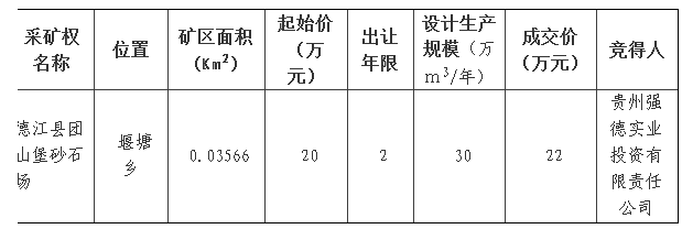 根據(jù)《中華人民共和國(guó)礦產(chǎn)資源法》、《貴州省礦業(yè)權(quán)招標(biāo)拍賣掛牌出讓暫行辦法》,銅仁市公共資源交易中心德江分中心于2018年10月17日 至 2018年10月30日16時(shí),對(duì)德江縣團(tuán)山堡砂石場(chǎng)采礦權(quán)進(jìn)行了公開(kāi)掛牌出讓,現(xiàn)將掛牌出讓結(jié)果公示如下: