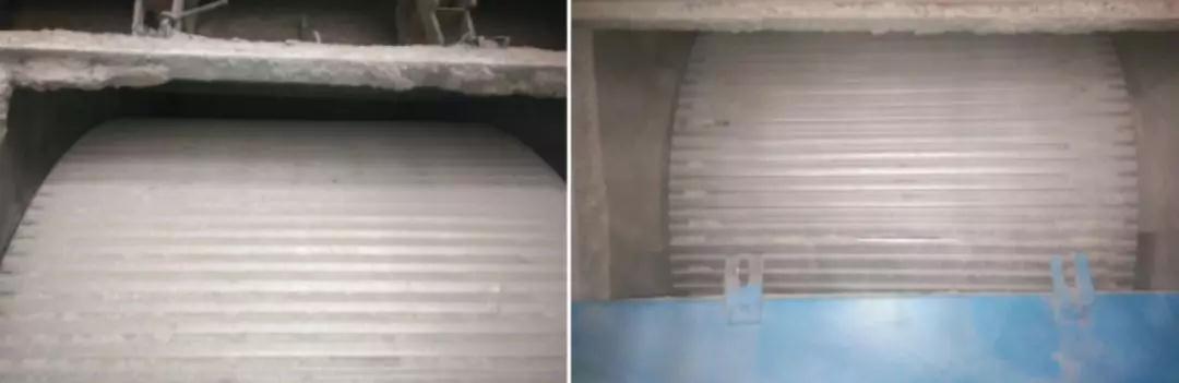 一、新材料合金輥優(yōu)秀的耐磨性。以 JM 公司為例,該公司是一條年產(chǎn) 200 萬噸水泥的全能生產(chǎn)線,配有兩套 170/100 輥壓機(jī)+Φ4.2×13m 水泥粉磨圈流系統(tǒng)。輥壓機(jī)輥?zhàn)釉褂枚押篙?,運(yùn)行功耗在 50~60%,入磨物料 R0.08 篩于 45%左右,2017 年 11 月改為新材料合金輥后,運(yùn)行功耗在 70-85%,入磨物料 R0.08篩于 25%左右,發(fā)揮出輥壓機(jī)的優(yōu)勢,系統(tǒng)能力大幅度提高。輥壓機(jī)累計(jì)運(yùn)行7380 小時(shí)(期間輥面完好,相比于輥?zhàn)痈鼡Q前提高臺產(chǎn)約 20t/h)檢查輥面,條紋高度減少約 2.5mm,情況如圖: