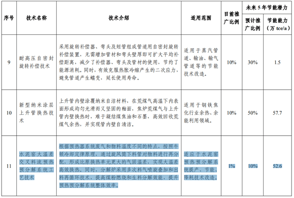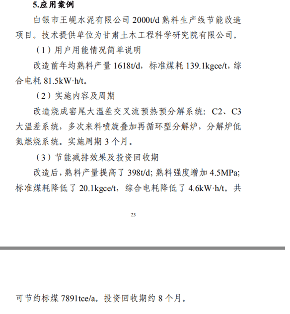 該技術(shù)適應(yīng)于水泥窯預(yù)熱預(yù)分解系統(tǒng)提產(chǎn)、節(jié)能、降耗技術(shù)改造。可以提高熟料產(chǎn)量 10~25%;提高熟料強(qiáng)度 1.0~3.5MPa;降低燒成煤耗 2.9~4.5kgce/t;降低綜合電耗 3.5~5.0kW·h/t;降低廢氣中 NOx含量 100~150ppm。預(yù)計(jì)未來(lái) 5 年,推廣應(yīng)用比例可達(dá)到 10%,可形成節(jié)能52.61 萬(wàn) tce/a,減排 CO2 136.79 萬(wàn) t/a。