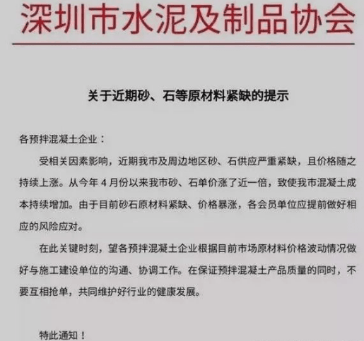 協(xié)會發(fā)文警示,砂石等原材料上漲近一倍