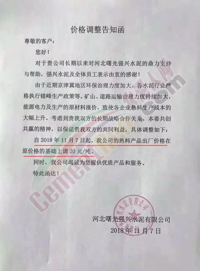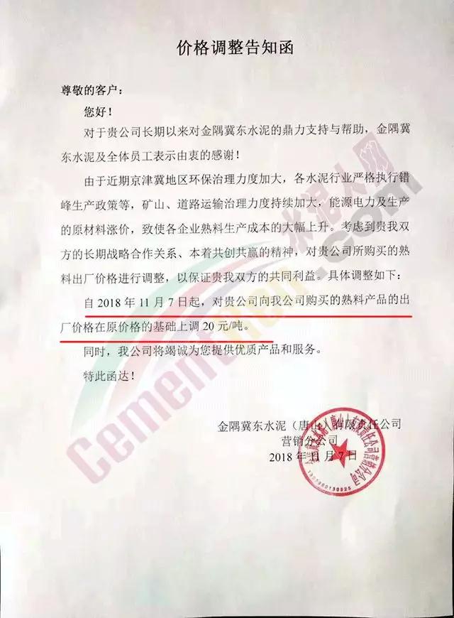 《價格調(diào)整告知函》稱,由于近期京津冀地區(qū)環(huán)保治理力度加大,各水泥行業(yè)嚴格執(zhí)行錯峰生產(chǎn)政策。礦山、道路運輸治理力度持續(xù)加大,能源電力及生產(chǎn)的原材料漲價,致使各企業(yè)熟料生產(chǎn)成本大幅上升。 因此上調(diào)熟料出廠價格。價格調(diào)整告知函原文如下: