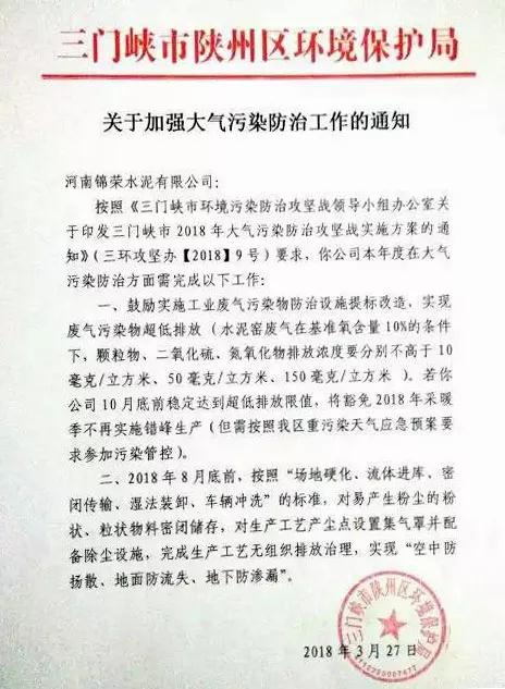 1.2018年3月,根據(jù)三門峽市物料堆場專項整治行動方案,陜州區(qū)環(huán)保局向河南錦榮水泥有限公司下達(dá)了治理通知,要求其于8月底前按照“場地硬化、流體進(jìn)庫、密閉傳輸、濕法裝卸、車輛沖洗”的標(biāo)準(zhǔn)進(jìn)行治理。