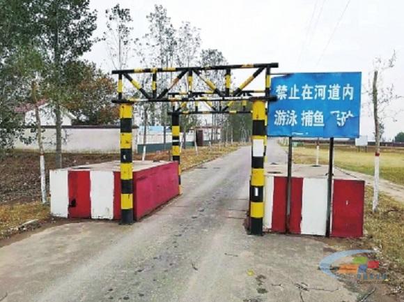 11月7日,記者驅(qū)車來到蘭考黃河大堤上,找到了舉報(bào)人所說的限高桿。不過限高桿已經(jīng)被焊死,焊接處的痕跡顯示,焊死的時間并不長。再向北走大約500米的距離,大堤東側(cè)為蘭考黃河河務(wù)局蔡集控導(dǎo)工程管理班和蘭考縣公安局黃河派出所警務(wù)室的辦公場所。這里還有一處水泥墩和限高桿共同組成的限高設(shè)施,限高又限寬,且限高桿上明確掛有“禁止在河道內(nèi)游泳、捕魚、采砂”的警示牌。那么運(yùn)砂車是怎么走上大堤的呢?