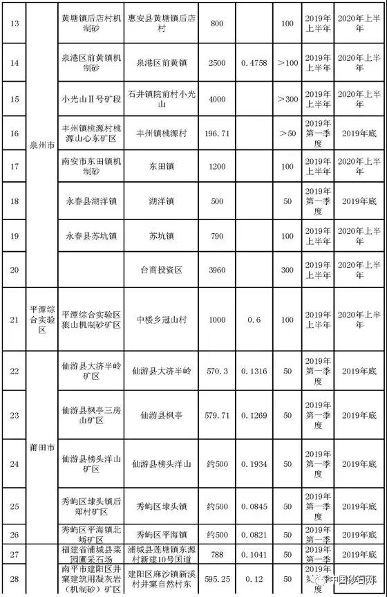 今天,《福建省國(guó)土資源廳 福建省住房和城鄉(xiāng)建設(shè)廳關(guān)于加快推進(jìn)機(jī)制砂項(xiàng)目配套礦山采礦權(quán)出讓工作的通知》在福建省自然資源廳網(wǎng)站公示。其中附件中有:《各設(shè)區(qū)市擬設(shè)機(jī)制砂項(xiàng)目配套礦山基本情況一覽表》,一共有52家機(jī)制砂礦區(qū),投產(chǎn)時(shí)間段在2019年到2020年之間。