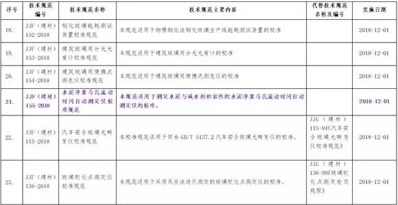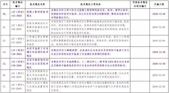 水泥行業(yè),編號JJF(建材)145-2018的混凝土配料秤校準(zhǔn)規(guī)范、編號JJF(建材)148-2018的水泥中氯離子含量測定用蒸餾儀校準(zhǔn)規(guī)范、編號JJF(建材)149-2018的水泥中游離氧化鈣絡(luò)合反應(yīng)裝置校準(zhǔn)規(guī)范、編號JJF(建材)155-2018的水泥凈漿馬氏流動時間自動測定儀校準(zhǔn)規(guī)范四項校準(zhǔn)規(guī)范被列入名單中,規(guī)范均從2018年12月1日起正式實施。