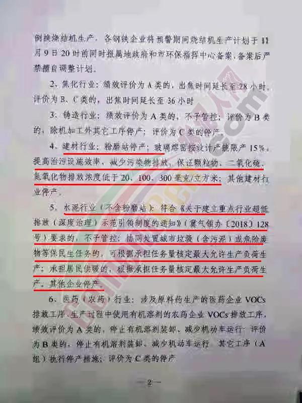 根據(jù)文件要求,水泥行業(yè)(不含粉磨站),符合《關(guān)于建立重點(diǎn)行業(yè)超低排放(深度治理)示范引領(lǐng)制度的通知》(冀氣領(lǐng)辦【2018】128號(hào))要求的,不予管控;協(xié)同處置城市垃圾(含污泥)或危險(xiǎn)廢物等保民生任務(wù)的,可根據(jù)承擔(dān)任務(wù)量核定最大允許負(fù)荷生產(chǎn);承擔(dān)居民供暖的,根據(jù)在承擔(dān)任務(wù)量核定最大允許生產(chǎn)負(fù)荷生產(chǎn),其他企業(yè)停產(chǎn)。文件原文如下: