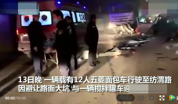 11月13日20時(shí)41分,在西安市灞橋區(qū)紡渭路新農(nóng)村附近,一輛水泥罐車與一輛面包車相撞,造成10死2傷。