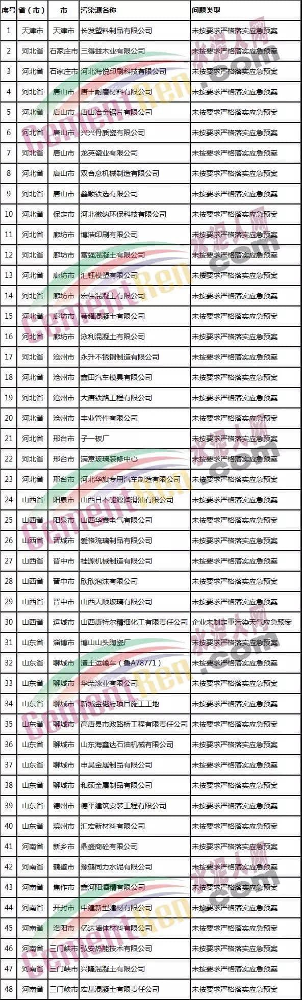 11月15日,2018-2019年藍天保衛(wèi)戰(zhàn)重點區(qū)域強化監(jiān)督工作組共檢查啟動重污染天氣應(yīng)急響應(yīng)城市1785家企業(yè)(點位),發(fā)現(xiàn)有48家企業(yè)(點位)未嚴格執(zhí)行重污染天氣應(yīng)急響應(yīng)要求(見附件)。