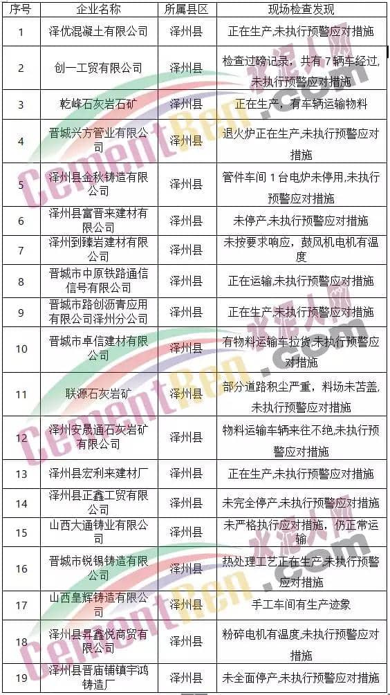 巡查發(fā)現(xiàn)的19家企業(yè),未嚴格落實重污染天氣應(yīng)急預(yù)案停產(chǎn)、限產(chǎn)、停止公路運輸?shù)纫蟆?br />