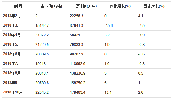 2018年10月全國水泥產(chǎn)量為22043.2萬噸,累計(jì)值為179463.4萬噸,同比增長(zhǎng)13.1%,累計(jì)增長(zhǎng)2.6%。
