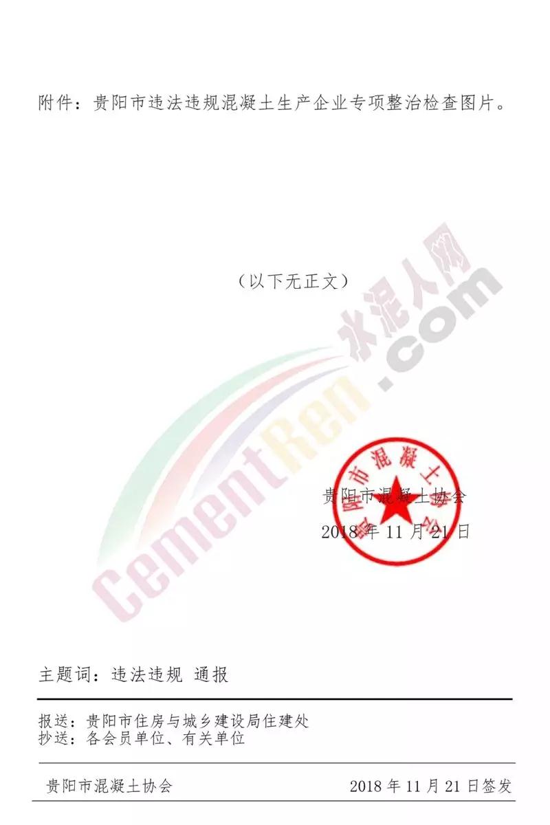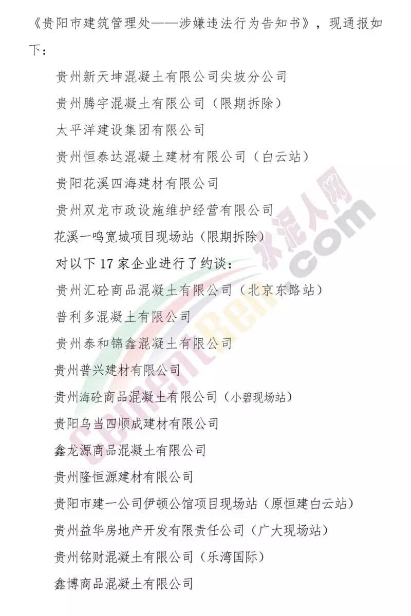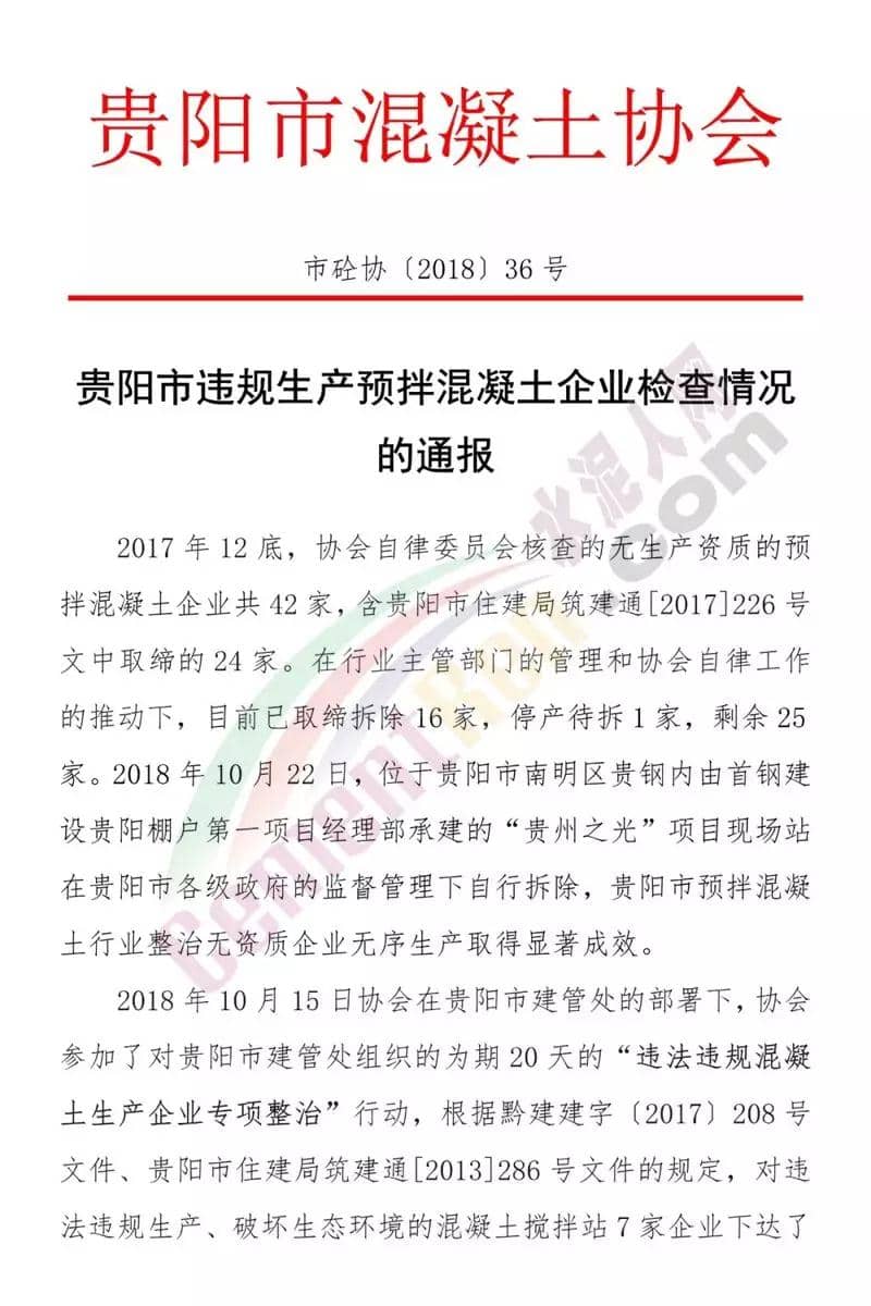 2018年10月15日協(xié)會在貴陽市建管處的部署下,參加了由貴陽市建管處組織的為期20天的“違法違規(guī)混凝土生產(chǎn)企業(yè)專項整治”行動,根據(jù)黔建建字【2017】2018號文件、貴陽市住建局筑建通【2013】286號文件的規(guī)定,對違法違規(guī)生產(chǎn)、破壞生態(tài)環(huán)境的混凝土攪拌站7家下達(dá)了《貴陽市建筑管理處——涉嫌違法行為告知書》。通報全文如下: