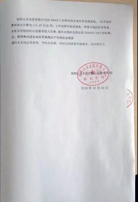 四、綜上,臨朐山水水泥有限公司自使用400m³/h的和風(fēng)佳會電化學(xué)處理系統(tǒng),一年節(jié)省的費用約為76.76萬元/年,帶來可觀的經(jīng)濟效益。水質(zhì)各項指標(biāo)較以前都有較大改善,循環(huán)水指標(biāo)全部達(dá)到GB50050-2007的標(biāo)準(zhǔn)。