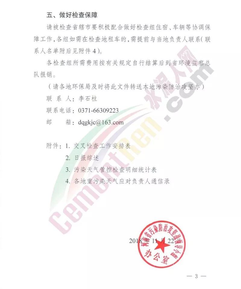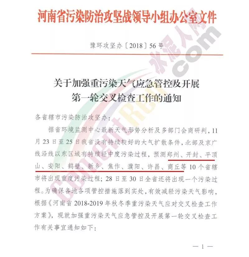 水泥人網(wǎng)最新消息,昨日(22日)河南省污染防治攻堅(jiān)戰(zhàn)領(lǐng)導(dǎo)小組辦公室發(fā)布《關(guān)于加強(qiáng)重污染天氣應(yīng)急管控及開展第一輪交叉檢查工作的通知》(豫環(huán)攻堅(jiān)辦【2018】56號文件。文件稱,根據(jù)河南省環(huán)境監(jiān)測中心最新天氣形勢分析及多部門會商研判,11月23日至25日河南省沒有持續(xù)較好的大氣擴(kuò)散條件,北部及京廣線沿線以東區(qū)域有持續(xù)輕中度污染過程,預(yù)測鄭州、開封、平頂山、安陽、鶴壁、新鄉(xiāng)、焦作、濮陽、許昌、商丘等10個省轄市將出現(xiàn)重度污染過程;28日至30日全省還將出現(xiàn)一個污染過程。