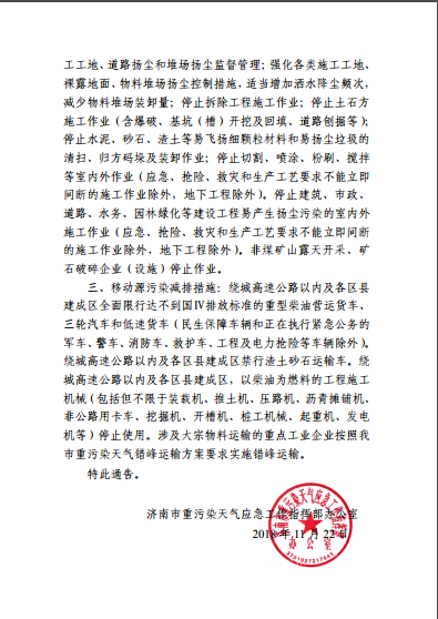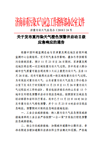 為有效應(yīng)對重污染天氣,山東省重污染天氣應(yīng)急工作小組辦公室下發(fā)《關(guān)于切實(shí)做好11月23日至11月26日重污染天氣過程應(yīng)對工作的函》,要求包括濟(jì)南在內(nèi)的山東省13個地市發(fā)布橙色預(yù)警并啟動Ⅱ級應(yīng)急響應(yīng)。按照國家區(qū)域應(yīng)急聯(lián)動部署和省環(huán)保廳要求,濟(jì)南已于11月22日18時30分發(fā)布重污染天氣橙色預(yù)警,并于11月23日0時啟動Ⅱ級應(yīng)急響應(yīng)。