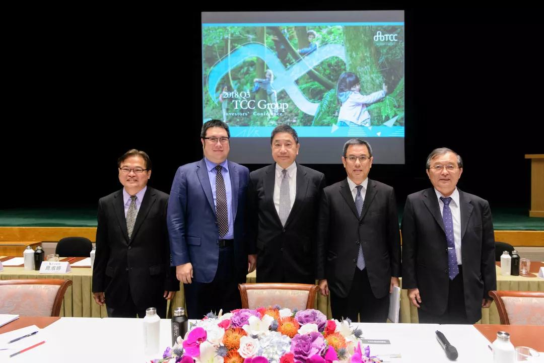 臺泥董事長張安平(中)與集團(tuán)企業(yè)中橡、信昌化董事長辜公怡(左二)、臺泥總經(jīng)理李鐘培(右二)、信昌化總經(jīng)理趙天福(右一)及中橡總經(jīng)理黃柏松(左一)一起參加法說會(huì)
