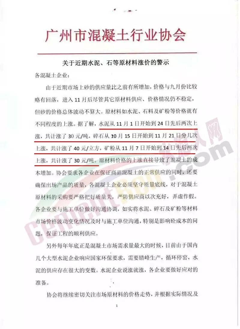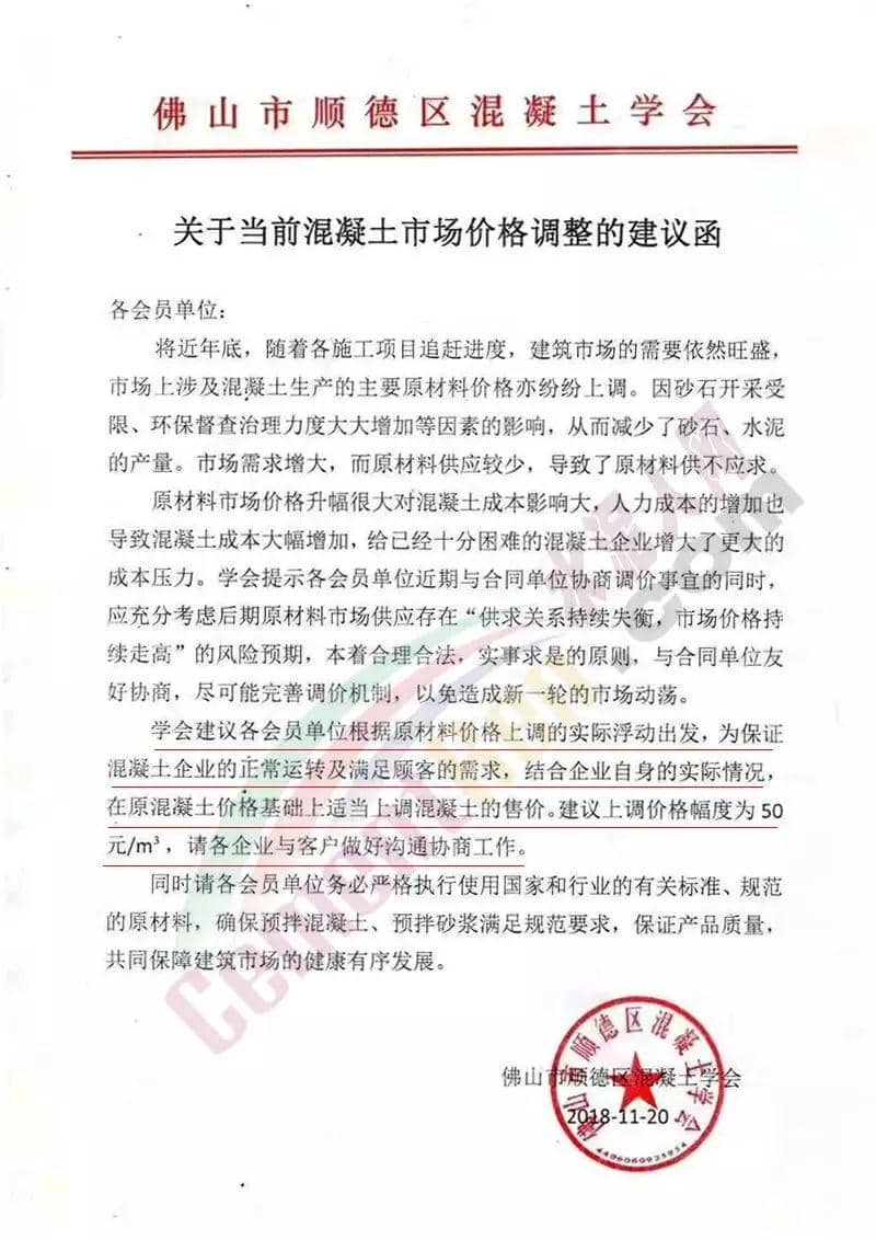 同一天,廣東省佛山市順德區(qū)混凝土學(xué)會發(fā)布了《關(guān)于當(dāng)前混凝土市場價(jià)格調(diào)整的建議函》。建議函稱將近年底,隨著各項(xiàng)施工項(xiàng)目追趕進(jìn)度,建筑市場的需要依然旺盛,市場上涉及混凝土生產(chǎn)的主要原材料價(jià)格亦紛紛上調(diào),且供不應(yīng)求,同時疊加人力成本的增加,使混凝土企業(yè)的成本壓力增大。