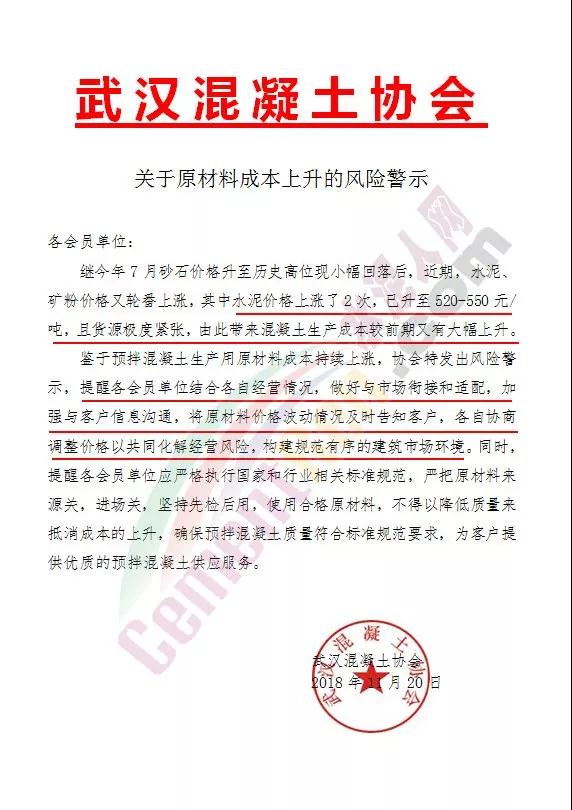 此前,武漢混凝土協(xié)會也曾發(fā)布預(yù)警通知稱,繼今年7月砂石價(jià)格升至歷史高位現(xiàn)小幅回落后。近期,水泥、礦粉價(jià)格又輪番上漲,其中水泥價(jià)格上漲2次,已升至520-550元/噸,且貨源極度緊張,由此帶來混凝土生產(chǎn)成本較前期又有大幅上升,鑒于預(yù)拌混凝土生產(chǎn)用原材料成本持續(xù)上漲,協(xié)會特發(fā)出風(fēng)險(xiǎn)警示。