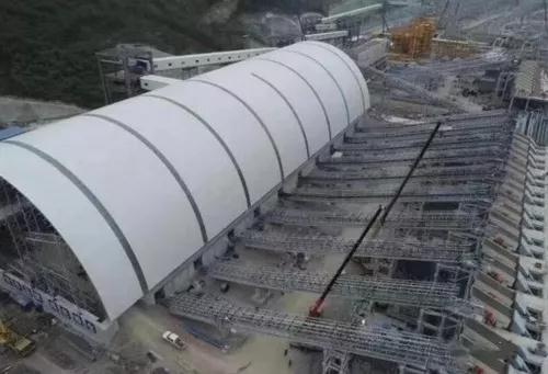 此外,這里安裝了單機處理能力達2000噸每小時的破碎設(shè)備和625噸每小時的篩分設(shè)備,有輸送能力達13000噸每小時的帶式輸送線,有重達73噸的單榀桁架和403噸的單座轉(zhuǎn)運站,有高40米、跨度110米、容量達80萬立方米的全封閉骨料倉等。