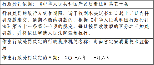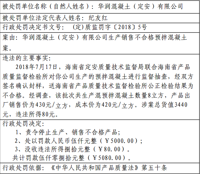 11月28日,海南省定安質(zhì)量技術(shù)監(jiān)督局發(fā)布五起2018年行政處罰案件,具體為海南海鑫隆塑膠制品有限公司無(wú)證生產(chǎn)不合格食品相關(guān)產(chǎn)品塑料飲料瓶被罰款46500元;海南銘傳塑膠有限公司定安分公司無(wú)證生產(chǎn)不合格食品相關(guān)產(chǎn)品塑料飲料瓶被罰款36000元;定安龍河培曹木材加工廠生產(chǎn)銷售不合格混凝土模板用膠合板被罰款1000元;華潤(rùn)混凝土(定安)有限公司生產(chǎn)銷售不合格預(yù)拌混凝土被罰款5000元;定安雷鳴宏發(fā)環(huán)保磚廠生產(chǎn)銷售不合格混凝土實(shí)心磚被罰款2170元。