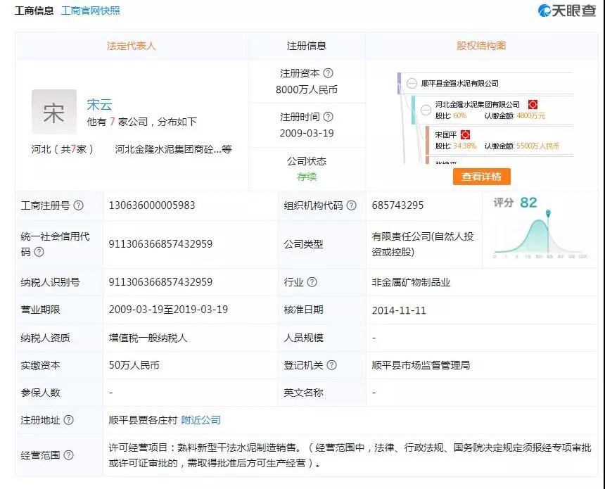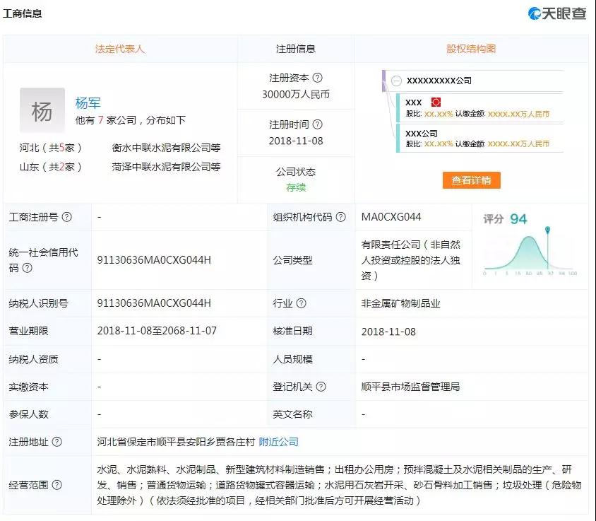 據(jù)查詢,保定中聯(lián)水泥于2018年11月8日登記注冊。法定代表人楊軍。注冊地址河北保定市順平縣安陽鄉(xiāng)賈各莊村。經(jīng)營范圍為水泥、水泥熟料、水泥制品、新型建筑材料制造銷售;出租辦公用房;預拌混凝土及水泥相關制品的生產(chǎn)、研發(fā)、銷售;普通貨物運輸;道路貨物罐式容器運輸;水泥用石灰?guī)r開采、砂石骨料加工銷售;垃圾處理等。