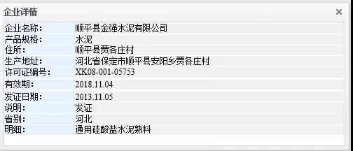 質(zhì)檢部局生產(chǎn)許可證辦公室相關數(shù)據(jù)顯示,順平縣金強水泥在2013年11月5日取得生產(chǎn)許可證,有效期至上月4日止。其產(chǎn)品明細為通用硅酸鹽水泥熟料。