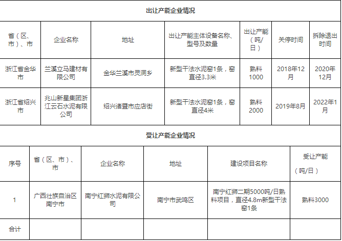 蘭溪立馬建材有限公司、兆山新星集團浙江云石水泥有限公司熟料產能出讓公示