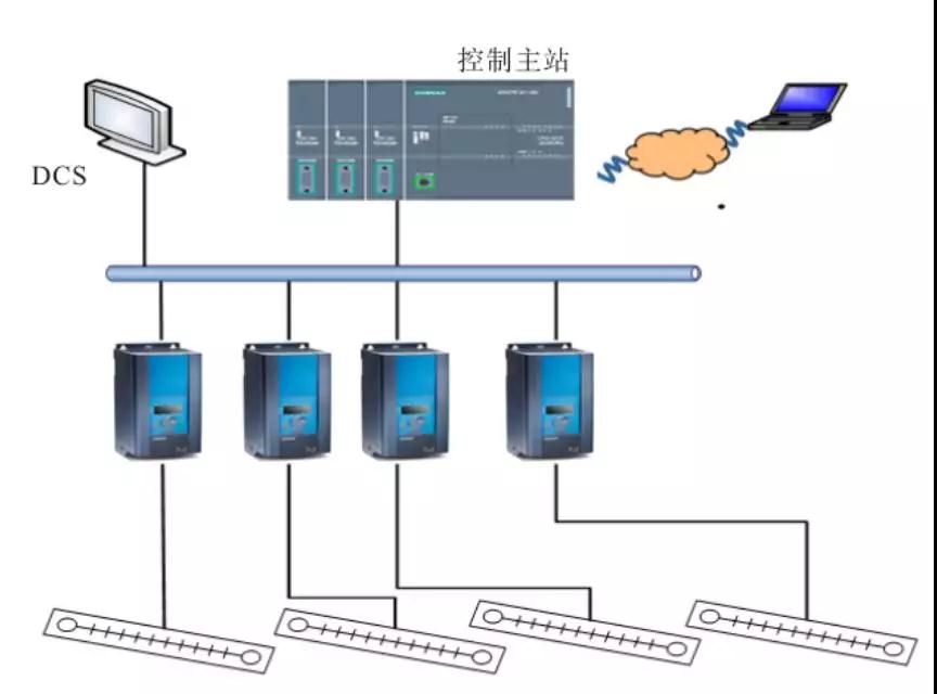 該智能變頻控制系統(tǒng)是以一臺(tái)高性能工業(yè)控制器和多臺(tái)變頻器為核心的控制平臺(tái),硬件配置包括:控制系統(tǒng)、可編程變頻調(diào)速控制系統(tǒng)、監(jiān)控系統(tǒng)(DCS,本地控制人機(jī)界面),如圖2所示。系統(tǒng)通過對(duì)拉鏈機(jī)的電壓、頻率、功率、轉(zhuǎn)速等多個(gè)參數(shù)的實(shí)時(shí)監(jiān)控,分析與計(jì)算,按照已設(shè)定好的程序及時(shí)調(diào)整其運(yùn)行模式,從而保障輸送設(shè)備在一個(gè)安全并節(jié)能的運(yùn)行速度運(yùn)行。