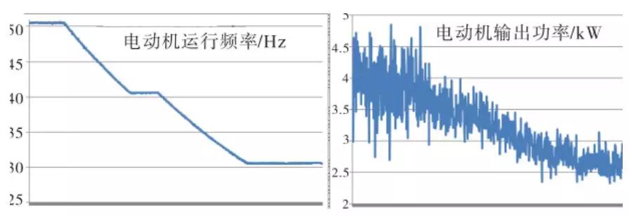 經(jīng)過一段時(shí)間的運(yùn)行論證和數(shù)據(jù)分析,拉鏈機(jī)電動(dòng)機(jī)運(yùn)行頻率降低40%時(shí),可以觀察到拉鏈機(jī)內(nèi)的料層厚度變化不大,電動(dòng)機(jī)實(shí)測轉(zhuǎn)矩也沒有明顯的增加,通過長時(shí)間數(shù)據(jù)采集和統(tǒng)計(jì)分析,發(fā)現(xiàn)其中1臺(tái)5.5 kW拉鏈機(jī)運(yùn)行在50 Hz和30 Hz時(shí),其電動(dòng)機(jī)平均功耗分別為4.1 kW和2.75 kW,降低了33%,見圖4。