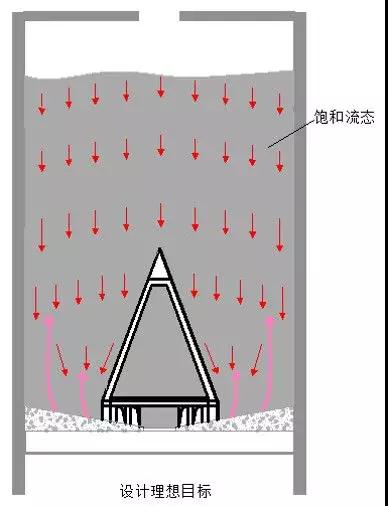 1. 由于全行業(yè)對(duì)粉體動(dòng)力學(xué)理論缺乏清晰完整的研究掌握,為了避免全空庫(kù)的中心漏斗流模式,一般在庫(kù)底都采用大型減壓錐設(shè)計(jì),以前期理論上通過(guò)改變庫(kù)底羅茨風(fēng)機(jī)多級(jí)環(huán)形斜槽陣的氣動(dòng)流化作用外擴(kuò)到庫(kù)底部外壁,進(jìn)而實(shí)現(xiàn)環(huán)庫(kù)的活化卸放,如圖2所示。