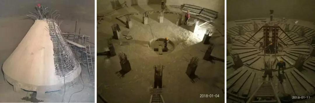而我們采用東方易經(jīng)的太極思維,要充分利用庫(kù)內(nèi)存料的巨大原重力下壓作為推動(dòng)力,為此我們針對(duì)性發(fā)明設(shè)計(jì)了無(wú)動(dòng)力鋼結(jié)構(gòu)太極錐;使其在出口上方形成陰陽(yáng)交錯(cuò)的多層破拱導(dǎo)流作用,可同時(shí)破除水平方向和垂直方向的向心收縮拱,并通過(guò)由低到高硬中軟的分層進(jìn)料排序設(shè)計(jì)自然形成環(huán)形庫(kù)壁硬料優(yōu)先的合理安排。如此這般,便巧妙產(chǎn)生了與庫(kù)內(nèi)料密度硬軟分布相匹配的動(dòng)力學(xué)設(shè)計(jì),一旦庫(kù)位發(fā)生偏移失衡,高出部位產(chǎn)生的料重力差將形成自動(dòng)正比例的糾偏推力,實(shí)現(xiàn)自主收斂性糾偏修正調(diào)節(jié),最終可實(shí)現(xiàn)環(huán)庫(kù)全料整體流自平衡卸放,如圖6所示。