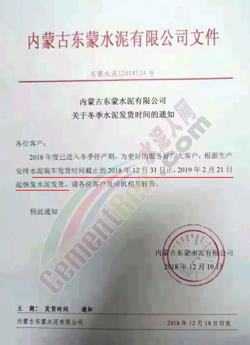 冬季水泥發(fā)貨時(shí)間通知稱,2018年度已經(jīng)進(jìn)入冬季停產(chǎn)期,根據(jù)生產(chǎn)安排水泥車發(fā)貨時(shí)間截止到2018年12月31日止,2019年2月21日起恢復(fù)水泥發(fā)貨。