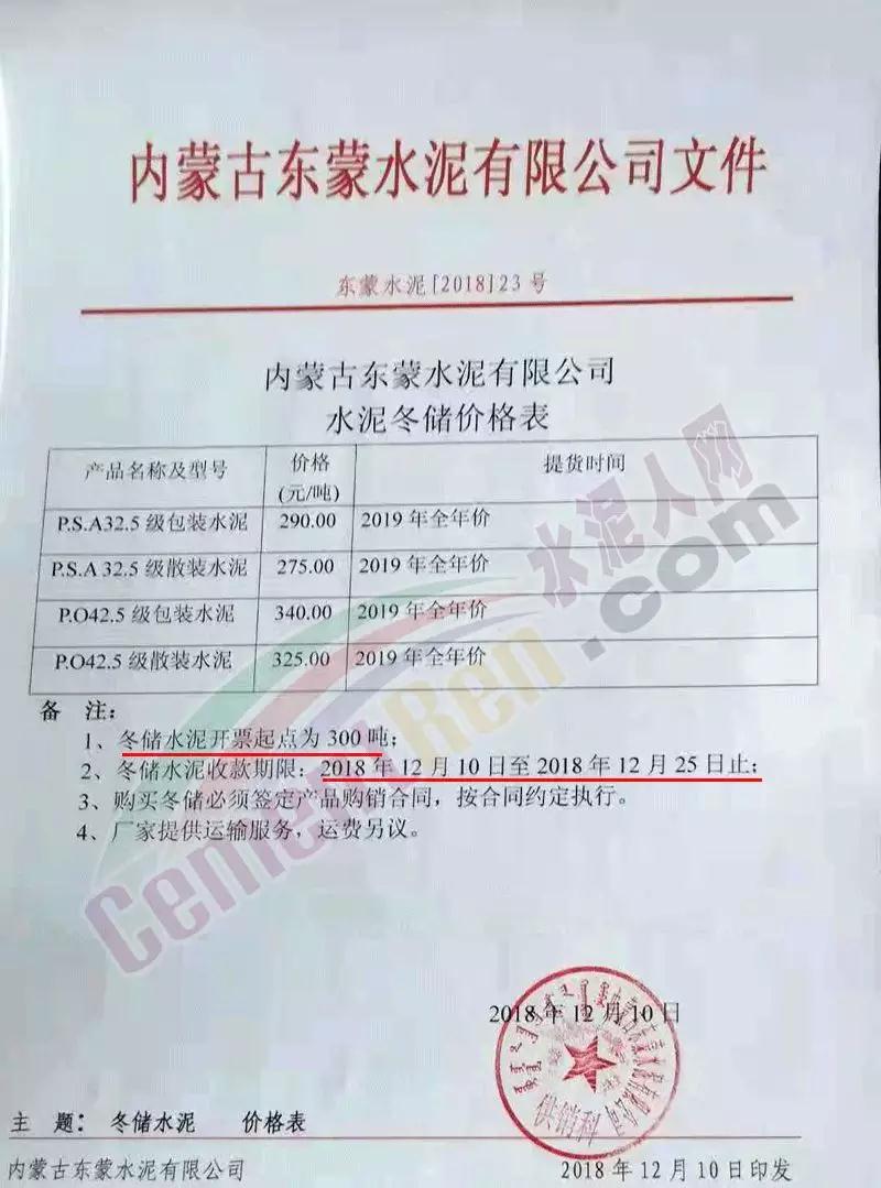 昨日(12月10日)內(nèi)蒙古東蒙水泥有限公司連發(fā)兩份通知,一為冬季水泥發(fā)貨時(shí)間通知,另一為冬儲(chǔ)水泥報(bào)價(jià)通知。通知稱水泥車發(fā)貨到本月底止?,F(xiàn)在起可訂購2019年提貨水泥。據(jù)水泥人網(wǎng)了解冬儲(chǔ)水泥出廠價(jià)較現(xiàn)行價(jià)格低30元/噸。