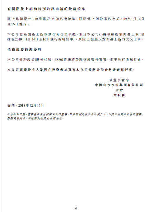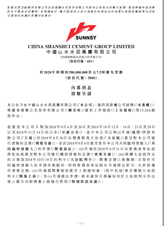 山水水泥(00691.HK)公告, 特別聆訊申請已獲接納,而開曼上訴聆訊已定于2019年1月14日至16日進行。公司認為開曼上訴并無任何合理依據(jù),并且公司將積極抵制開曼上訴(包括在2019年1月14日至16日進行的聆訊中),已提起反對開曼上訴的交叉上訴。債務(wù)證券持續(xù)停牌。