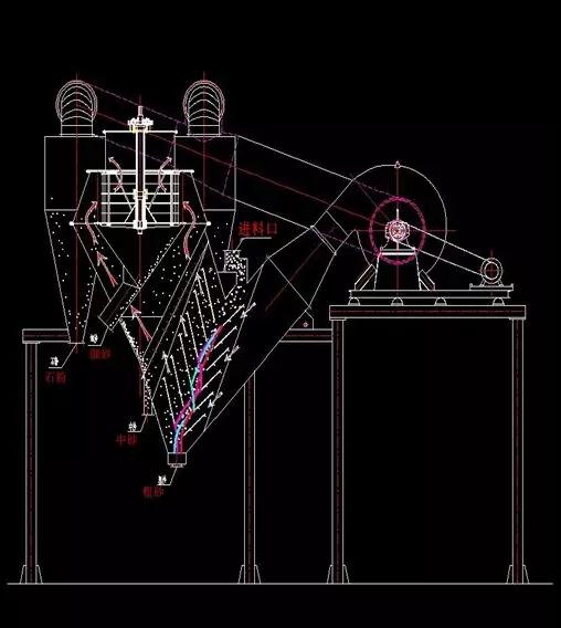 吉能達公司將V型選粉機和自主研發(fā)的三分離選粉機有機的結(jié)合,研制出復(fù)合式機制砂風(fēng)選脫粉機,該產(chǎn)品已獲得江蘇省科技廳高新技術(shù)產(chǎn)品認(rèn)定,被國家科技部列為機制砂風(fēng)選脫粉產(chǎn)業(yè)化創(chuàng)新項目。該產(chǎn)品利用V型選粉機將4.75~2.37mm的粗顆粒率先分離出來,粗顆??稍倩刂粕皺C繼續(xù)制砂,也可作為成品出售,中砂和細(xì)砂通過V后被上部的籠型轉(zhuǎn)子分離出來,0.075mm的細(xì)粉則被旋風(fēng)筒收集下來,從而實現(xiàn)脫粉的目的。