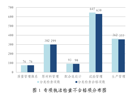三季度專項執(zhí)法檢查內(nèi)容包括:預(yù)拌混凝土企業(yè)的質(zhì)量管理體系、原材料管理、配合比設(shè)計、試驗管理、生產(chǎn)管理等方面,共計檢查預(yù)拌混凝土企業(yè)34家次,1478項次,其中合格1450項,合格率為98.1%,不合格項主要出現(xiàn)在試驗管理方面,具體情況見圖1。在執(zhí)法檢查的同時對預(yù)拌混凝土試塊(拌合物)、原材料進(jìn)行了抽檢,其中抽檢混凝土試塊(拌合物)115組,合格113組,合格率為98.3%,預(yù)拌混凝土出廠質(zhì)量良好;抽檢原材料67組,全部合格??傮w來看,我市預(yù)拌混凝土質(zhì)量整體穩(wěn)定可靠。