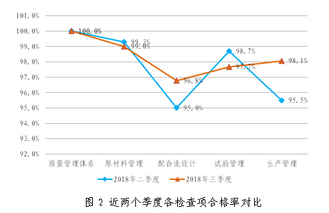 與二季度相比,原材料管理合格率下降0.3個百分點,配合比設(shè)計合格率提升1.8個百分點,試驗管理合格率下降1個百分點,生產(chǎn)管理合格率提升2.6個百分點,具體情況見圖2。