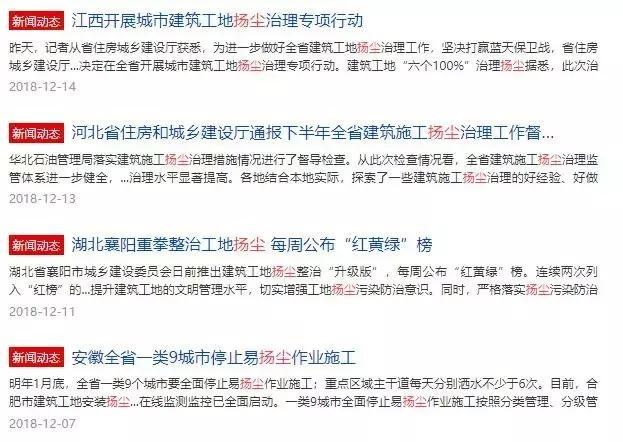除了承接上游傳導(dǎo)而來的環(huán)保轉(zhuǎn)型壓力外,下游建筑企業(yè)還不得不同時(shí)經(jīng)受環(huán)保風(fēng)暴中的揚(yáng)塵整治壓力:每到秋冬季節(jié),建筑工地?fù)P塵治理工作都是各地的監(jiān)管重點(diǎn)。在生態(tài)環(huán)保部明確指出禁止“一刀切”做法的同時(shí),各地為確保揚(yáng)塵治理達(dá)標(biāo)也“各出奇招”,如被列入湖北襄陽揚(yáng)塵整治“紅”榜的企業(yè)將在招投標(biāo)活動(dòng)中受到限制。