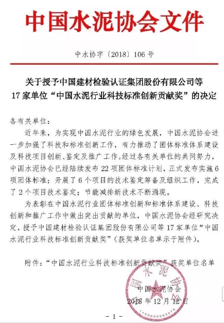 中國(guó)水泥協(xié)會(huì)為表彰中國(guó)水泥行業(yè)團(tuán)體標(biāo)準(zhǔn)創(chuàng)新和標(biāo)準(zhǔn)體系建設(shè)、科技創(chuàng)新和推廣工作中做出突出貢獻(xiàn)的單位,舉辦了“中國(guó)水泥行業(yè)科技標(biāo)準(zhǔn)創(chuàng)新貢獻(xiàn)獎(jiǎng)”評(píng)選活動(dòng),其中山東山水水泥,華潤(rùn)水泥控股,南方水泥、廣靈金隅水泥、堯柏特種水泥等16家單位被授予“中國(guó)水泥行業(yè)科技標(biāo)準(zhǔn)創(chuàng)新貢獻(xiàn)獎(jiǎng)”。